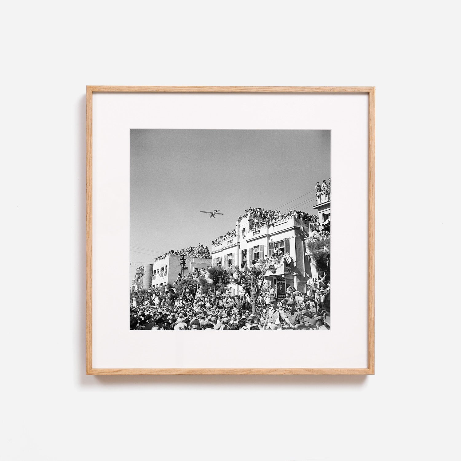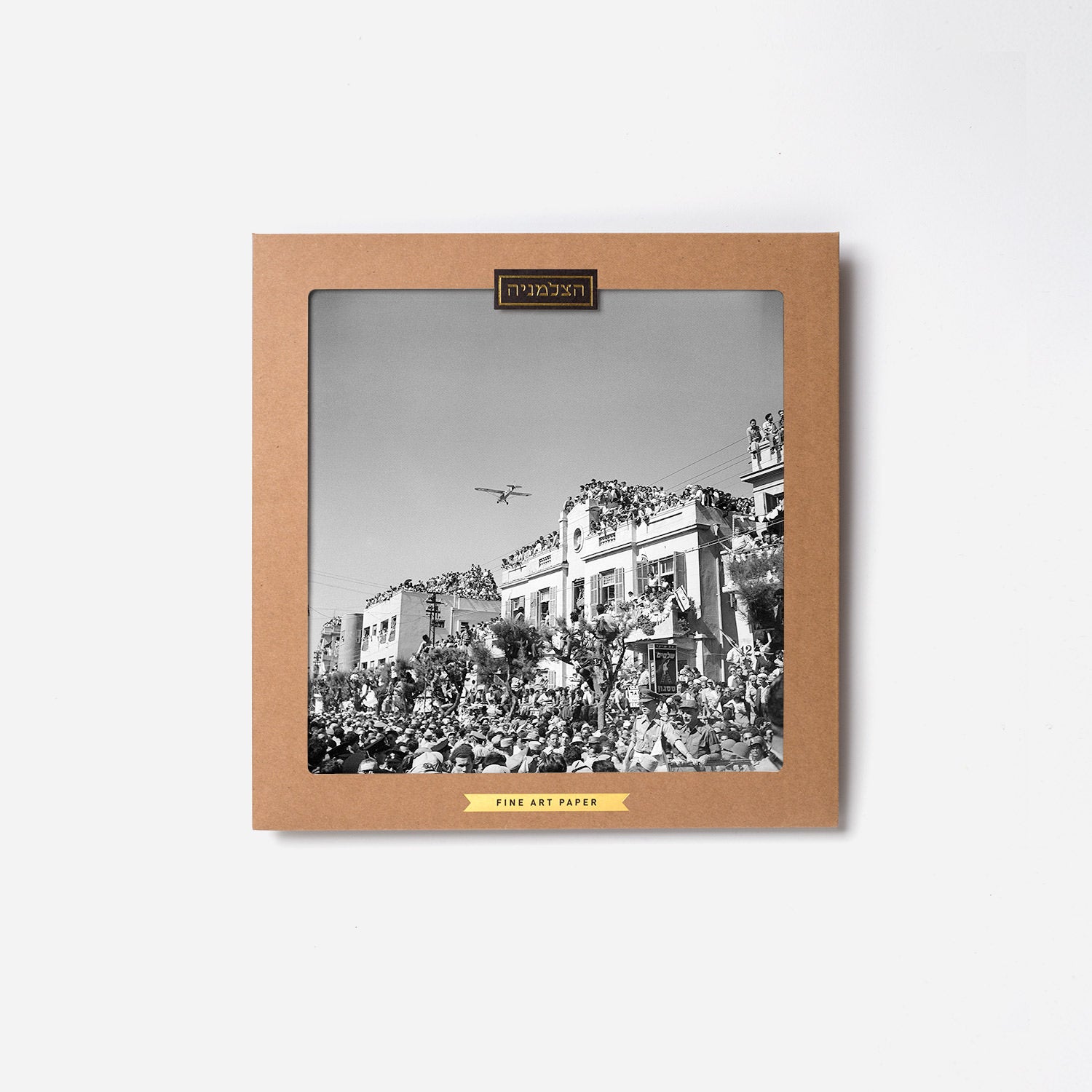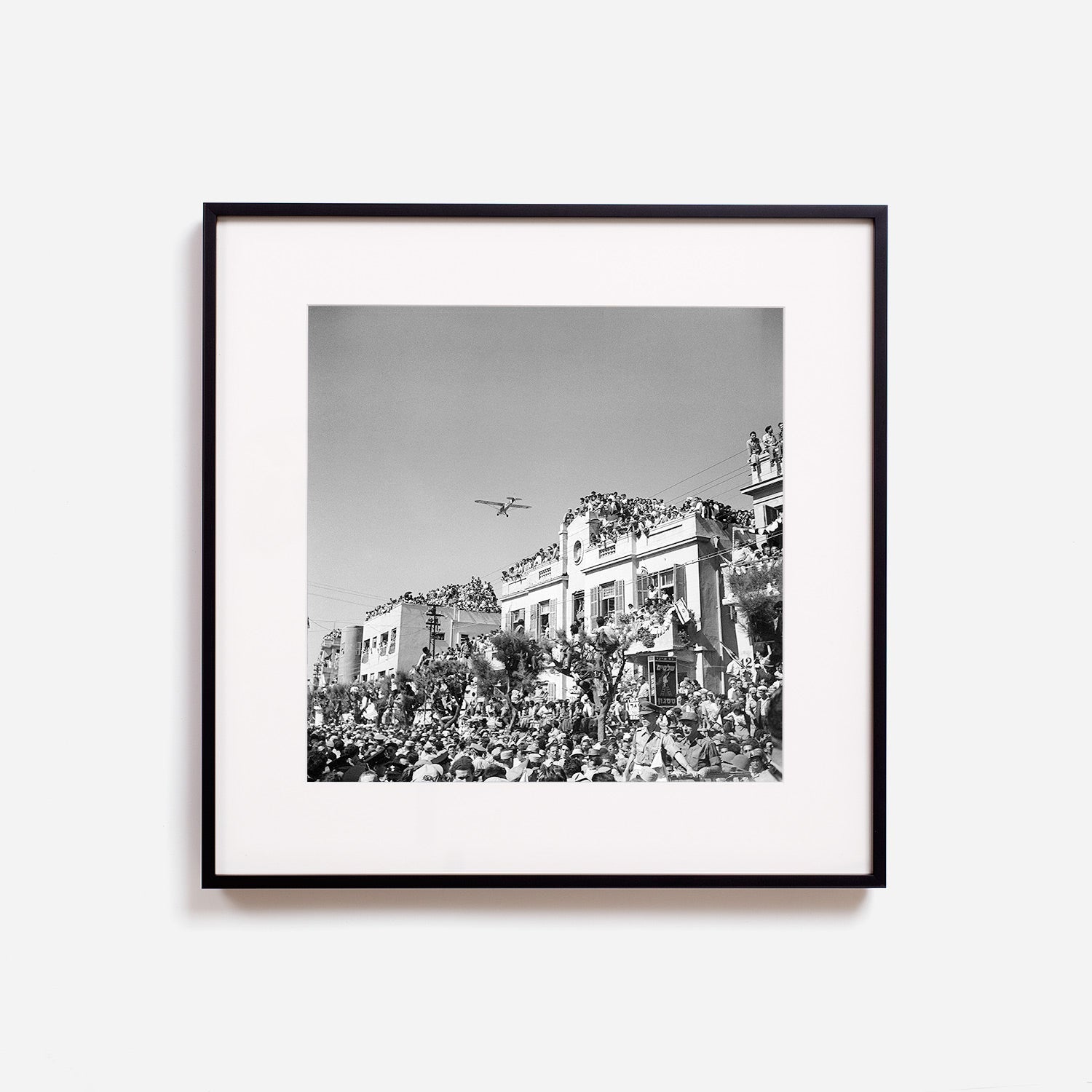 מאות אלפים הגיעו בה' באייר תש"ט (1949) למצעד הגדול לציון חגיגות יום העצמאות הראשון של מדינת ישראל. אך ההמונים שעמדו על מסלול המצעד לא אפשרו לחיילים להתחיל בצעידה וכך זכה האירוע בשמו ההיסטורי העגום "המצעד שלא צעד". התמונה צולמה בתחילת רחוב בן יהודה, קרוב לאלנבי ולצלמניה. המבנים הנראים בצילום נבנו בשנות ה-20 אך נהרסו בשנות ה-70 לטובת בית-מלון חדש.