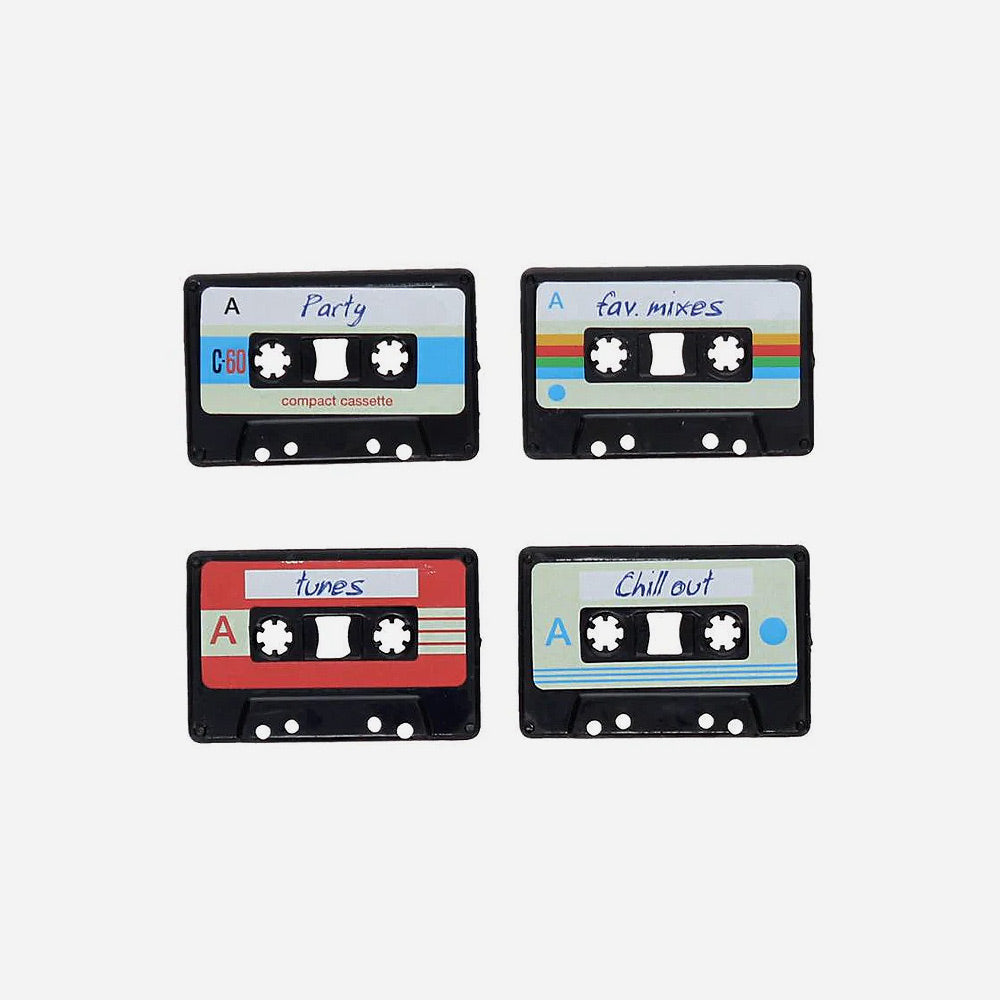 סט של 4 מגנטים למקרר בדוגמת קסטות. מושלם לאוהובי מוזיקה להוספת אופי רטרו למקרר שלכם.