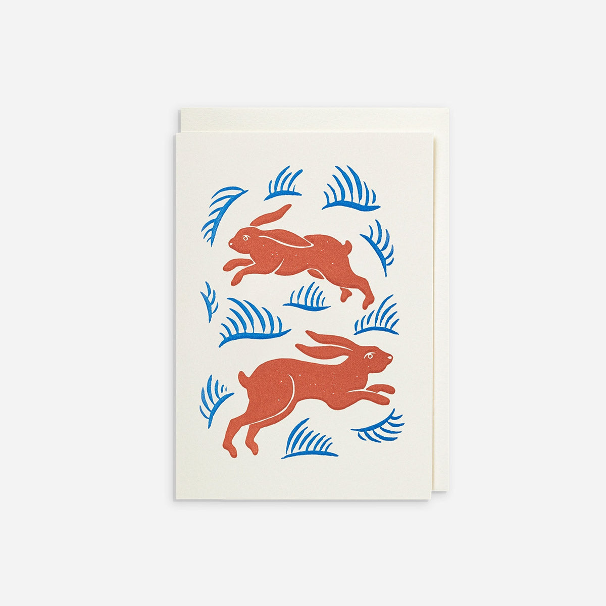 כרטיס קטן בהדפסה ראשית עם איור של שני ארנבות אדומות הקופצות בין עלי דשא.