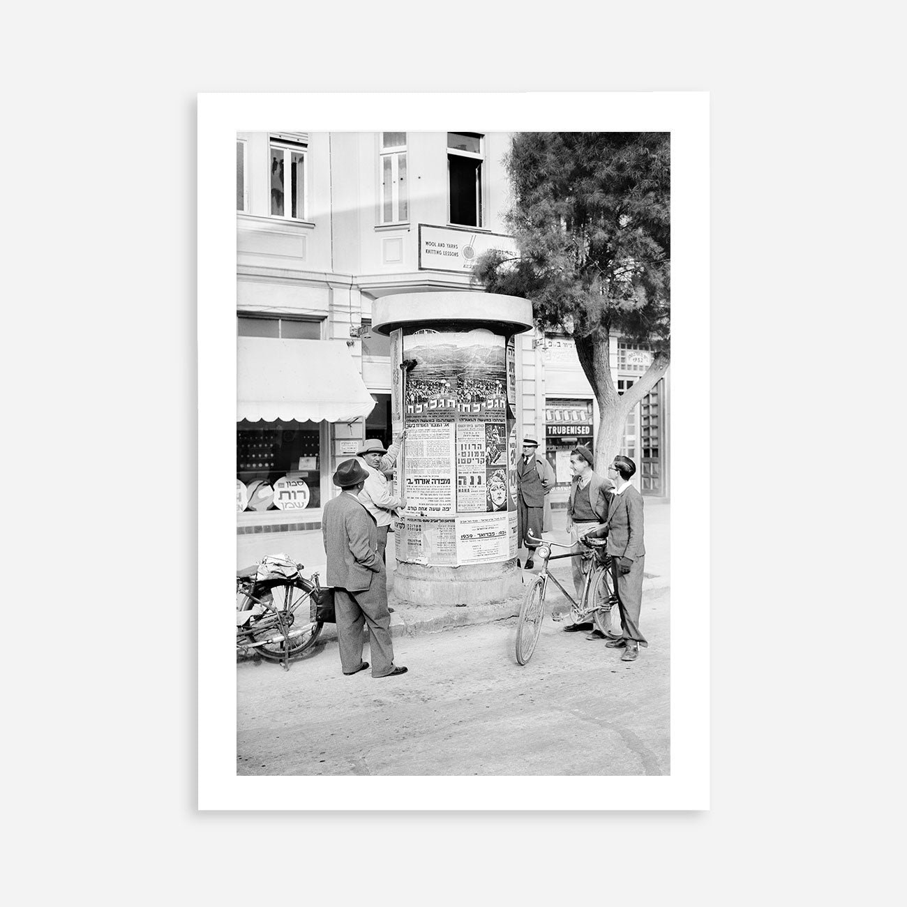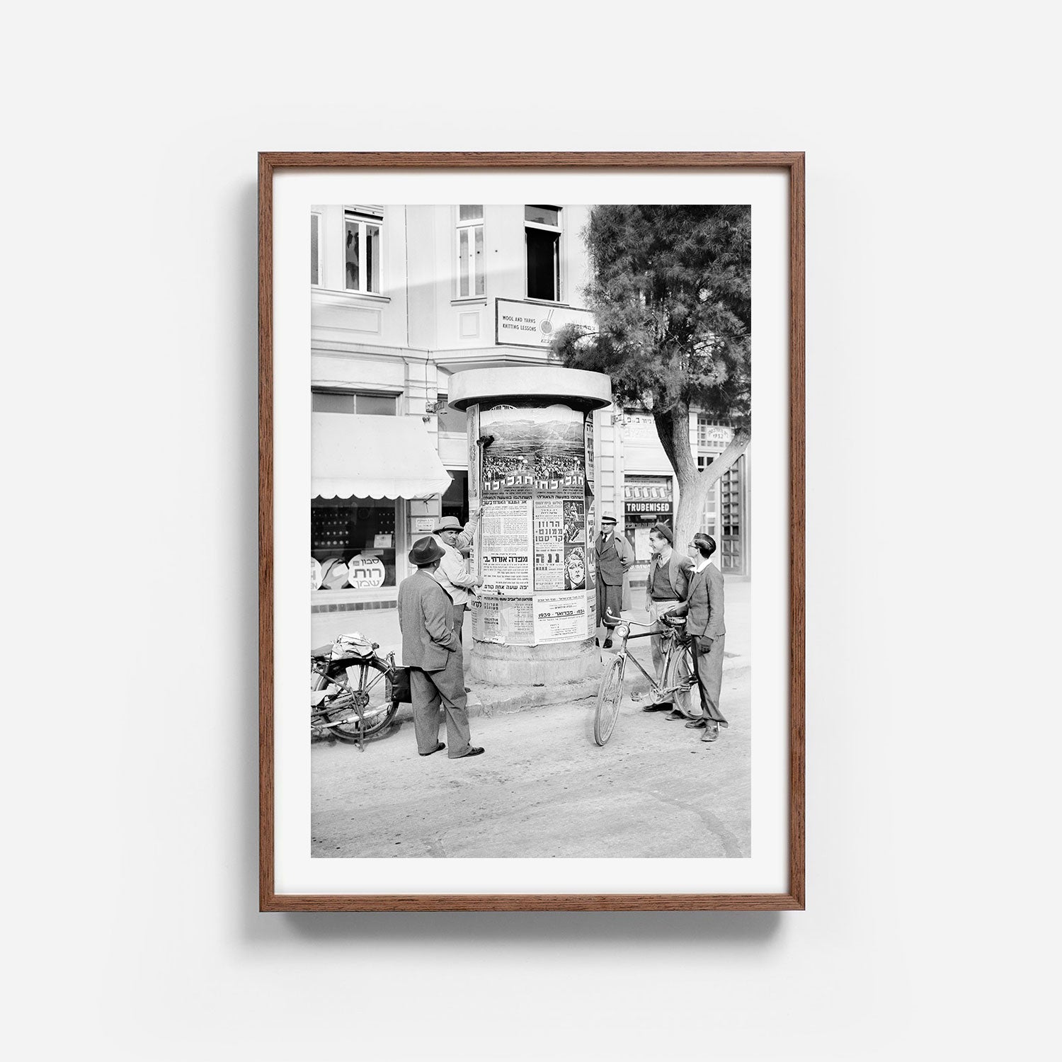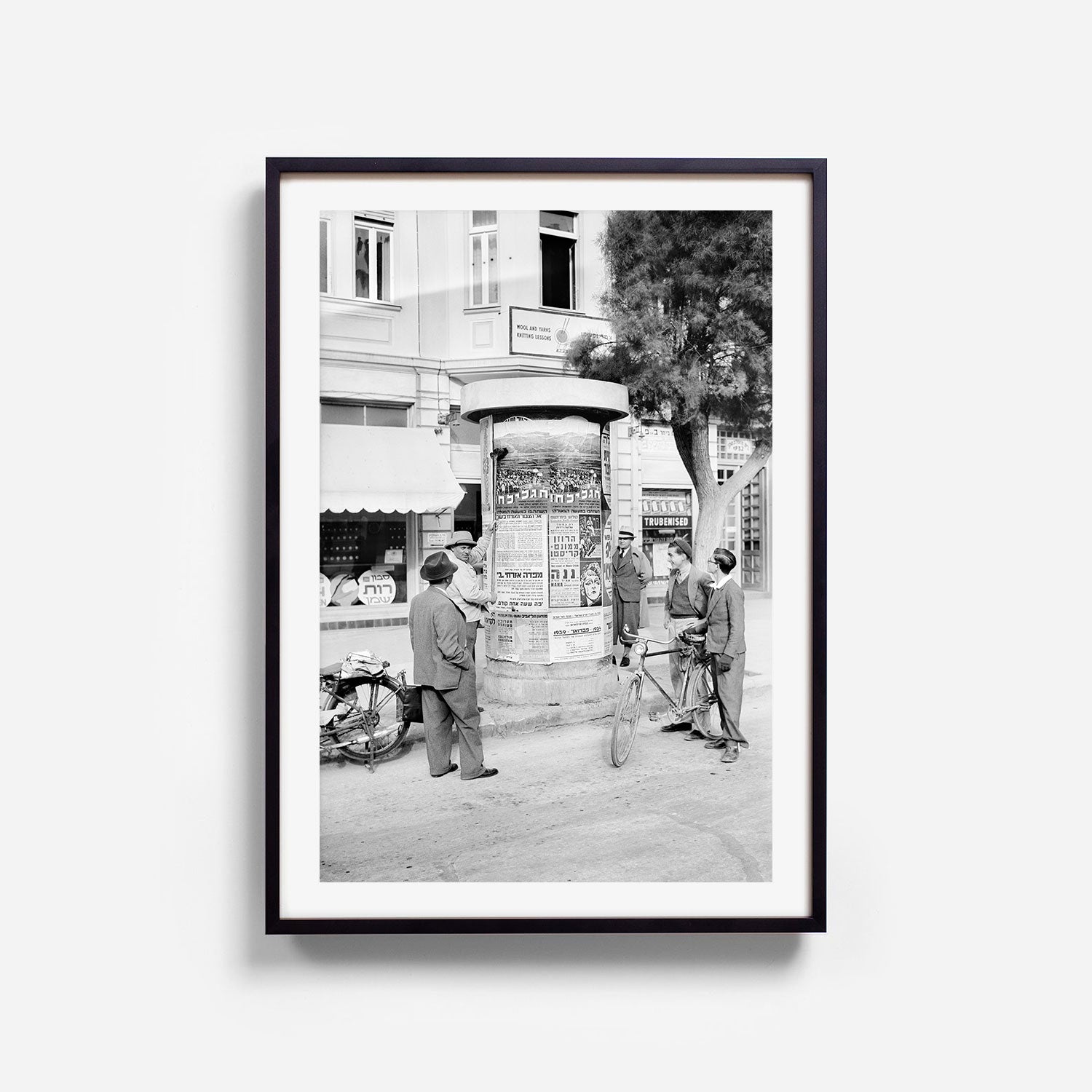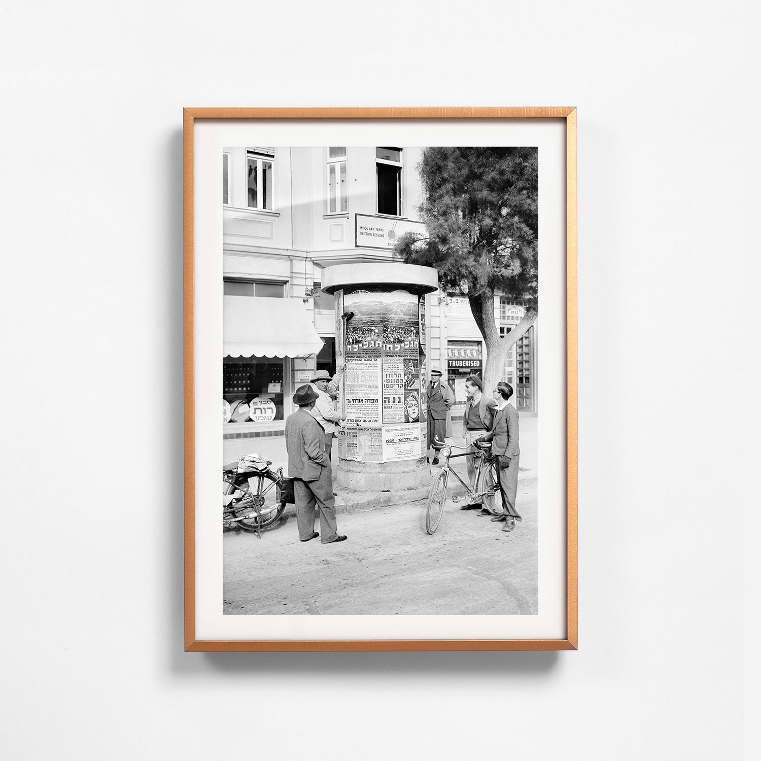 רחוב בן יהודה בשנת 1938, מול קולנוע מוגרבי וקפה גינתי נחשב למרכז השוקק של תל אביב. בתקופה זו טרם הומצאה הטלויזיה ואפילו רדיו לא היה מצוי בכל בית, לוחות מודעות היו מקור להפצת מידע: ממופעי תרבות ועד כרוזי תעמולה וגיוס כספים - המילה המודפסת היתה חזקה ואנשים מתגודדים סביב לוח מודעות היה מראה יומיומי טיפוסי.